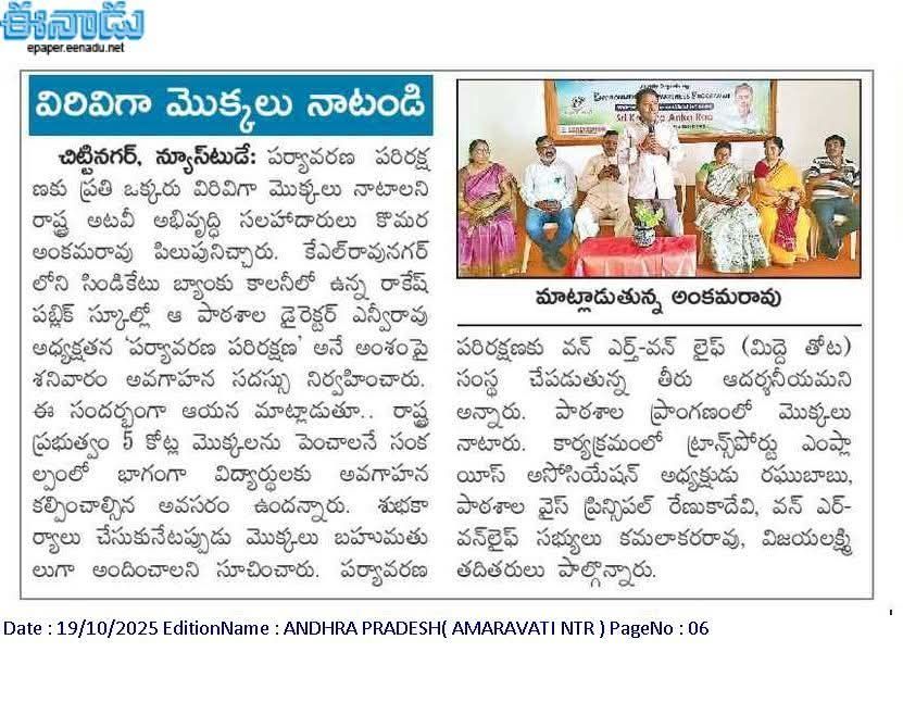 #5కోట్లమొక్కలు నాటి పెంచే కార్యక్రమంలో భాగంగా విద్యార్థులు ప్రతి ఒక్కరు మొక్కలు నాటి పరిరక్షణ చేయాలి అని పర్యావరణవేత్త కొమెర అంకారావు పిలుపునిచ్చారు. విజయవాడ ఒన్ ఏర్త్ ఒన్ లైప్ సంస్థ వారు ఏర్పాటు చేసిన కార్యక్రమంలో భాగంగా రాకేష్ పబ్లిక్ స్కూల్ విద్యార్థి, విద్యార్థులకు విత్తనబంతులు ( సీడ్ బాల్స్ ) ద్వారా మొక్కలు పెరిగే విధానం గురించి వివరించడం జరిగింది. మొక్కలు, చెట్లు వాటి ఔషద విలువలు గురించి, మన పూర్వికులు అచరించిన పద్ధతులు, అడవులు వలన ఉపయోగములు గురించి విపులంగా చెప్పడం జరిగింది. ఈ కార్యక్రమం పట్ల ఆకర్షలైన విద్యార్థులు మొక్కలు నాటి పరిరక్షణ చేస్తాము అని ప్రతిజ్ఞ చేశారు. ఒన్ ఏర్త్ ఒన్ లైప్ లీలా కుమారి ఏలూరి గారు మిద్దె తోటలు ఉపయోగములు, వాటి మెలుకువలు గురించి విద్యార్థులకు వివరించారు.